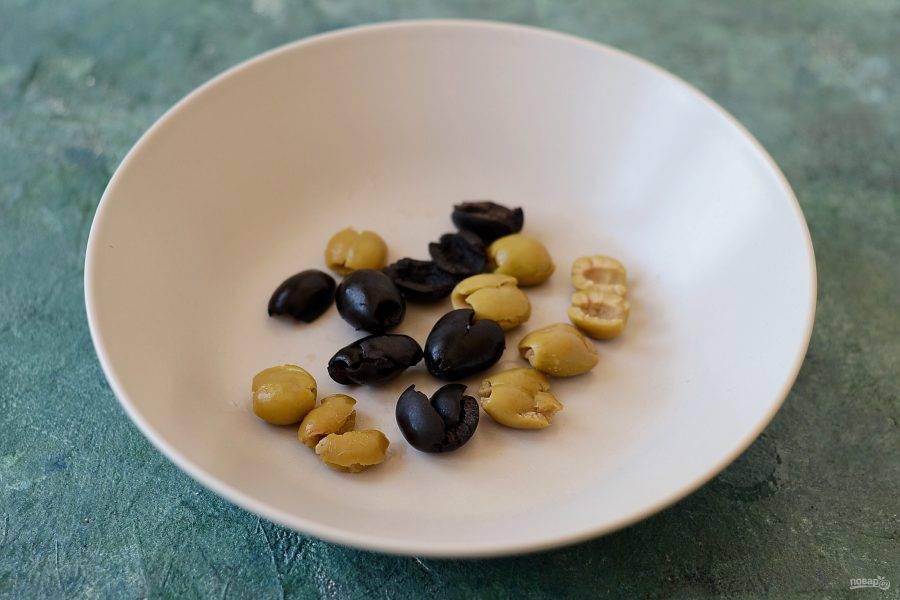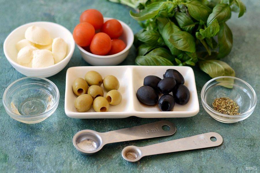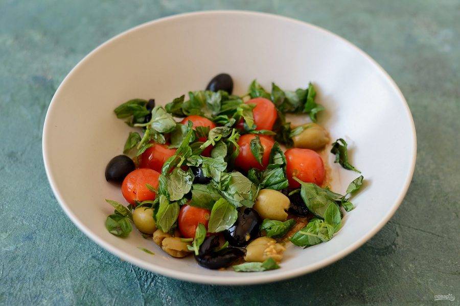 Базилик помойте, обсушите. Отделите листья от стебля и крупно порубите. Переложите в миску. Заправьте салат оливковым маслом.