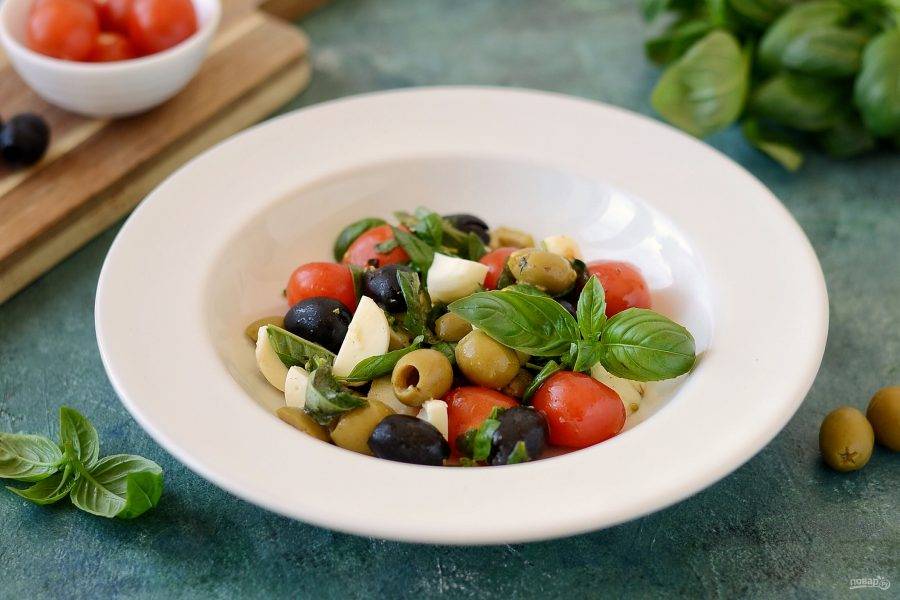 Сыр моцарелла нарежьте ломтиками, добавьте средиземноморские травы. Аккуратно перемешайте салат.