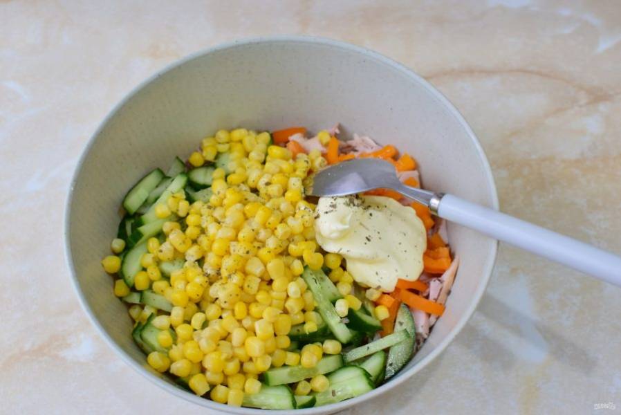 С кукурузы слейте жидкость и добавьте зерна в салат. Заправьте майонезом. По вкусу добавьте горчицу, соль и перец.