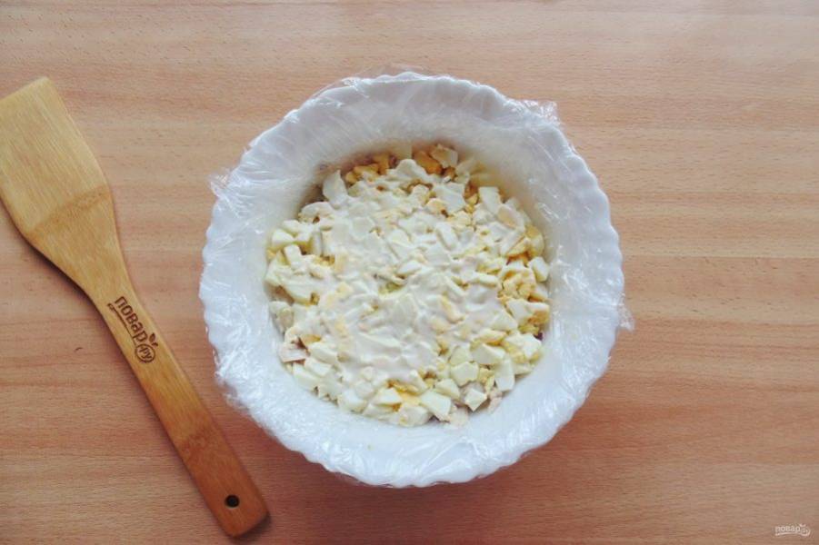 Яйца сварите вкрутую, охладите, очистите и мелко нарежьте. Выложите последним слоем салата.