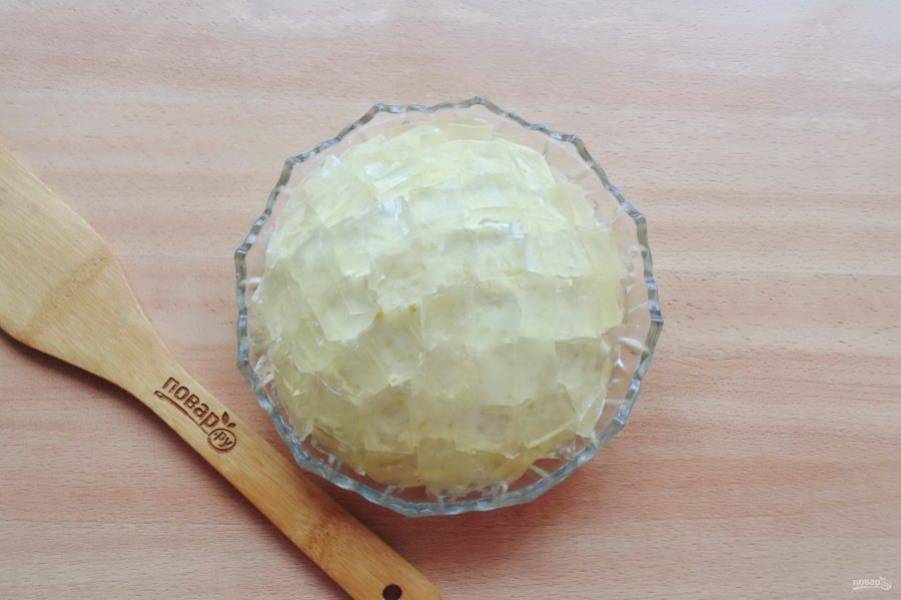 Пока "хрусталь" застывает, приготовьте салат. Картофель сварите в "мундире", охладите, очистите и натрите на терке. В салатник постелите пищевую пленку, чтобы края её свисали. Выложите в салатник картофель.