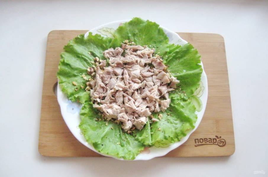 Отварную курицу нарежьте и выложите следующим слоем. Посолите по вкусу.