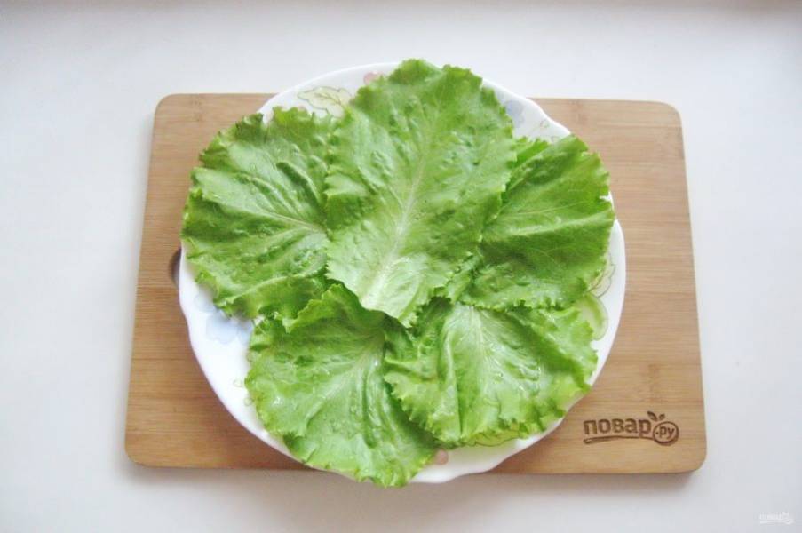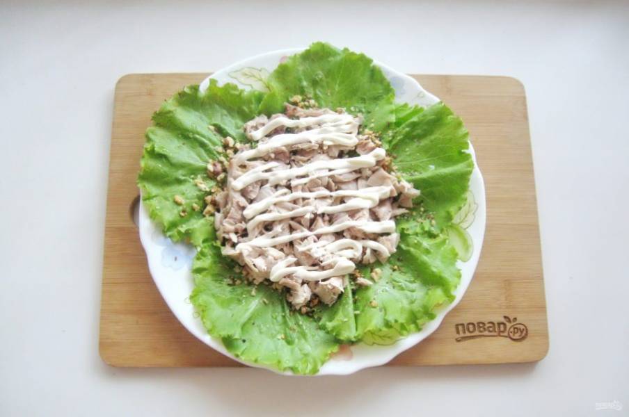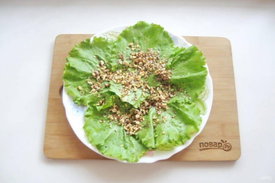 Грецкие орехи подсушите в духовке или в сковороде, после измельчите и выложите на листья.