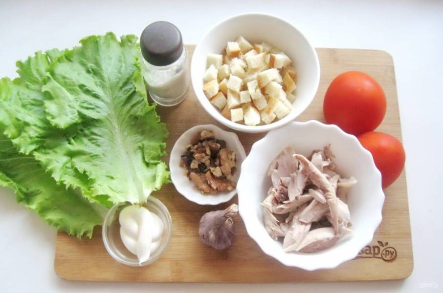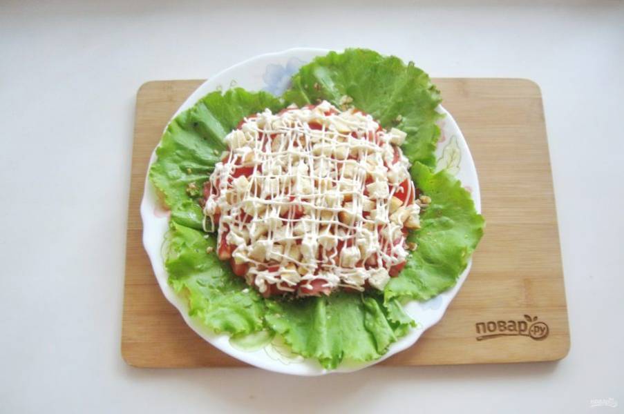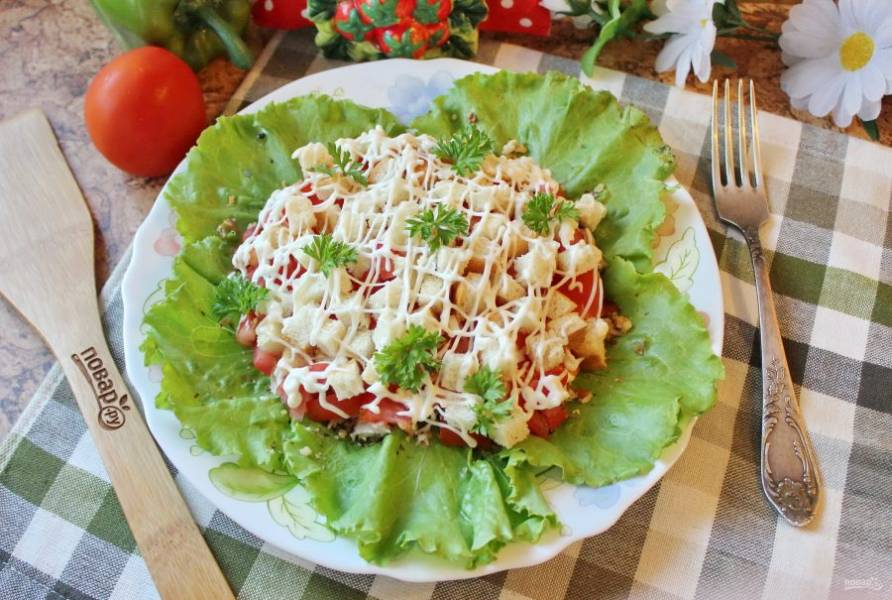 Покройте сухарики сеточкой майонеза. Поставьте салат в холод на несколько часов.