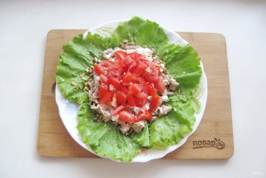 Помидоры нарежьте кубиками и выложите на курицу. Посолите по вкусу.