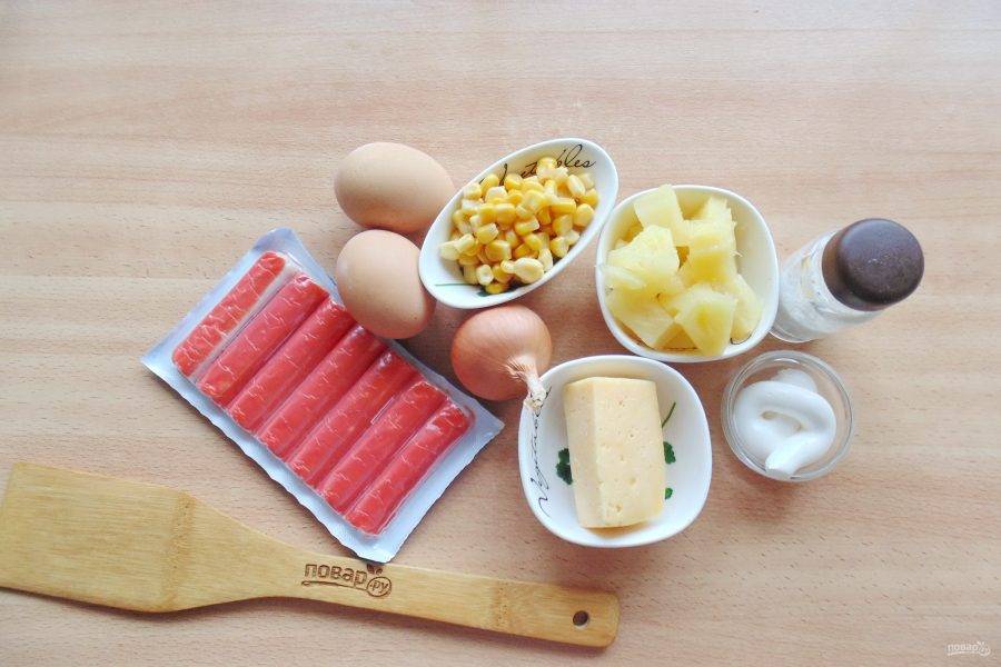 Уже несколько десятилетий заморский фрукт ананас заполняет прилавки наших магазинов и перестал быть чем-то необычным. Предлагаю рецепт отличного салата с ананасом. Такая закуска подойдет на праздник.