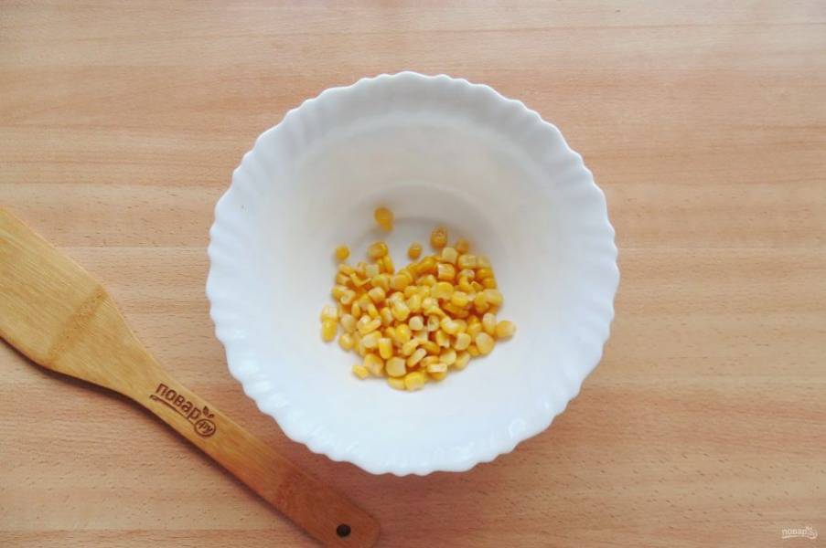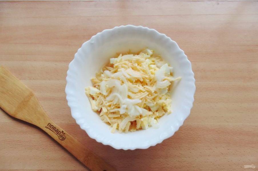 Яйца сварите вкрутую, охладите, очистите и мелко нарежьте. Выложите в салат.
