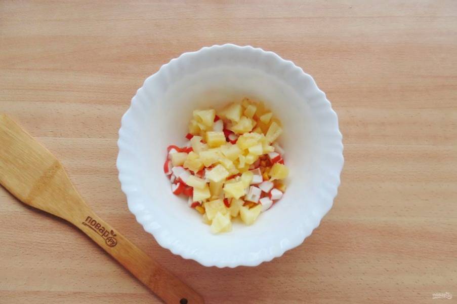 Ананас нарежьте небольшими кубиками и выложите в салат.