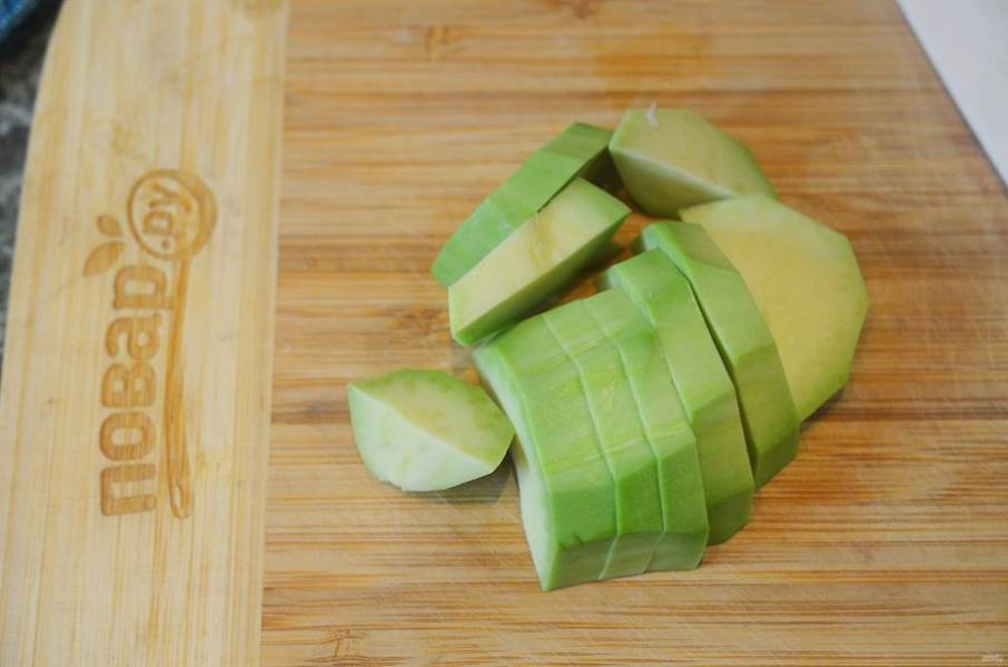 2. Авокадо очистите, нарежьте полукругом и обжарьте.