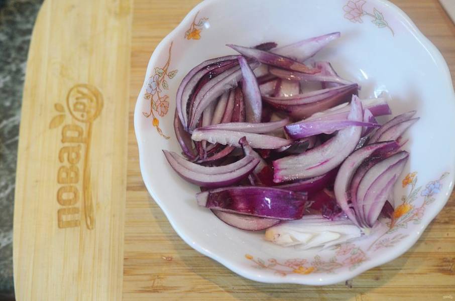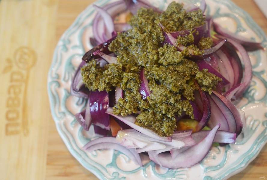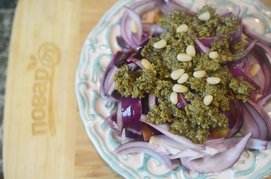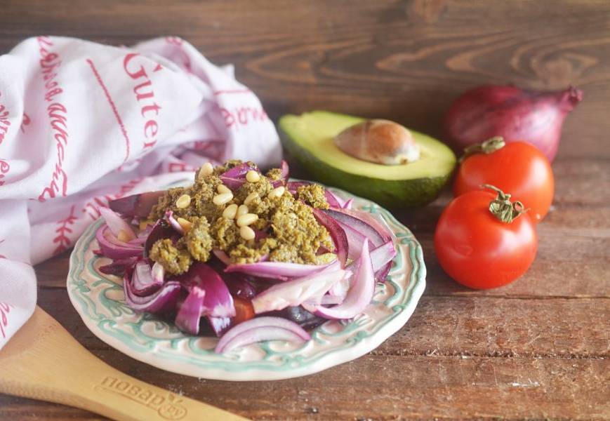 5. Полейте лук лимонным соком и оливковым маслом. Выложите на авокадо.