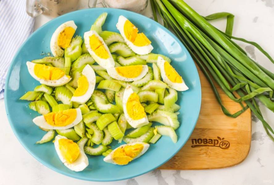 Промойте стебли сельдерея, нарежьте их кусочками и выложите нарезку на тарелку.