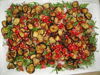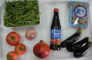 На блюдо выложите рукколу, на нее - слой помидоров и лука, затем баклажаны. Посыпьте салат тертыми орехами и зернами граната. Полейте соусом из граната с маслом. Специи добавьте по вкусу.