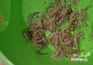 Чистим лук, нарезаем полукольцами. Выкладываем его в миску, посыпаем солью и перцем. Заливаем лимонным соком или уксусом - пусть маринуется, пока мы будем заниматься другими ингредиентами.