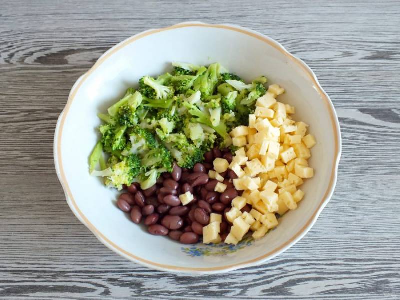Размороженную брокколи разберите на соцветия, переложите в салатник. Сыр нарежьте кубиком, переложите к брокколи. Также добавьте отварную фасоль.