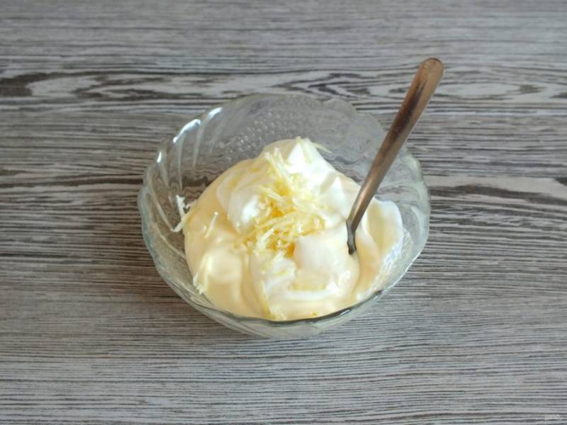 В отдельной чаше смешайте майонез со сметаной. Добавьте измельченный чеснок. Перемешайте.
