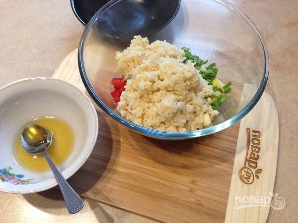 9. Булгур можно добавлять к остальным ингредиентам или горячим, или холодным, решайте сами :) Добавим молотый черный перец и заправку.