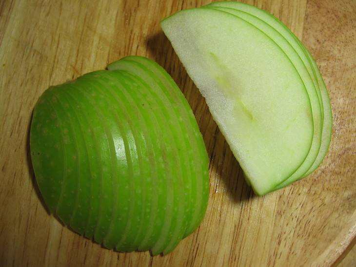 Тонко-тонко нарезаем яблоки и спрыскиваем их лимонным соком.