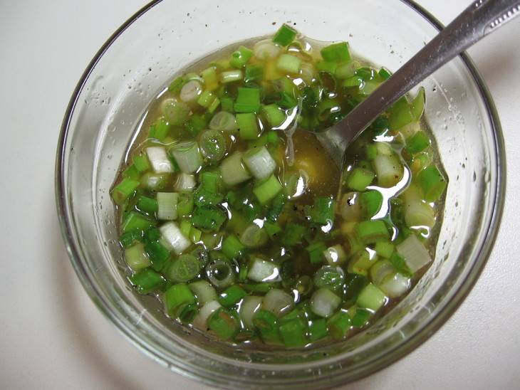 Смешиваем в одной миске измельченный зеленый лук, сахар, соль, лимонный сок, уксус, оливковое масло.