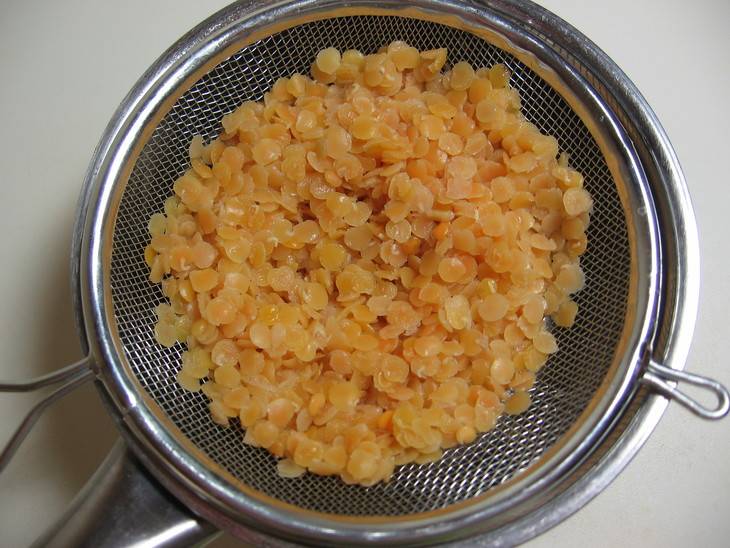 Моем чечевицу холодной водой, варим до мягкости. Откидываем на дуршлаг. Рекомендуется чечевицу предварительно замочить на час-два и затем отваривать в той же самой воде.