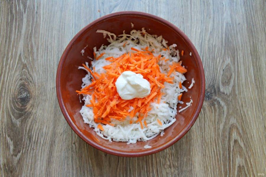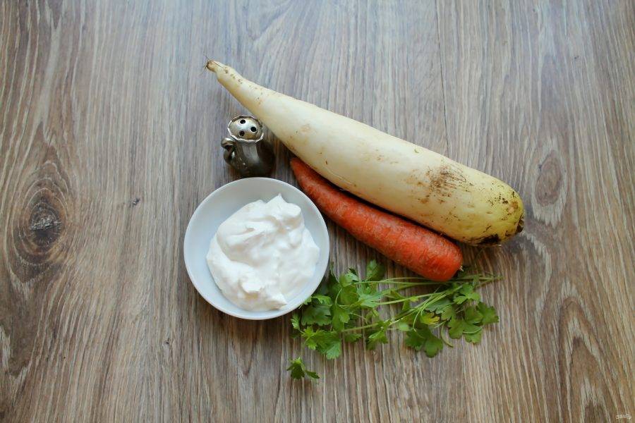 Подготовьте все необходимые ингредиенты для приготовления салата из дайкона со сметаной. Овощи вымойте, обсушите и почистите от кожуры.