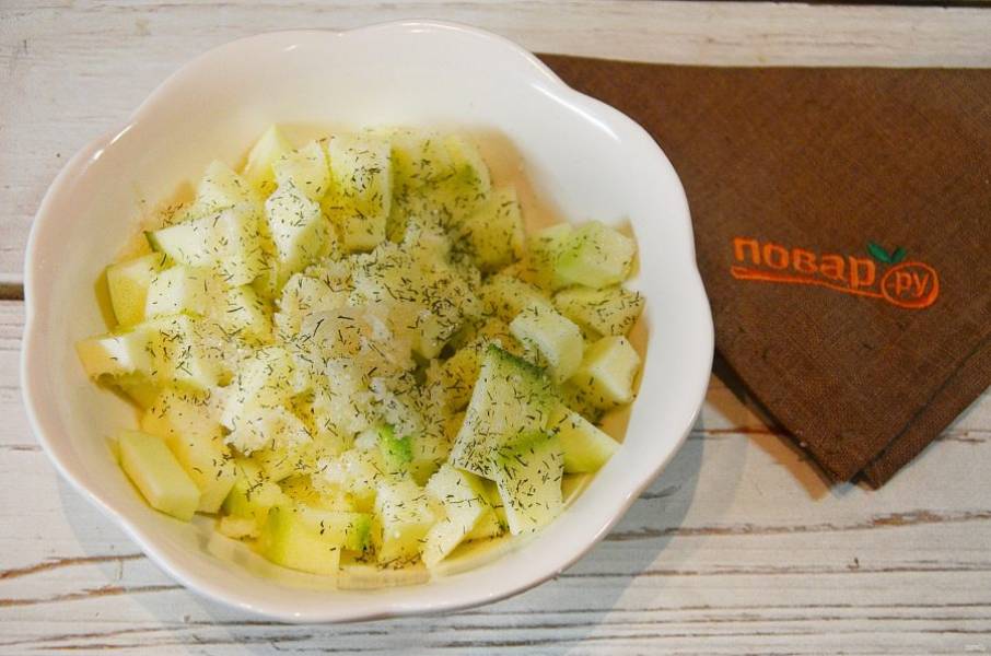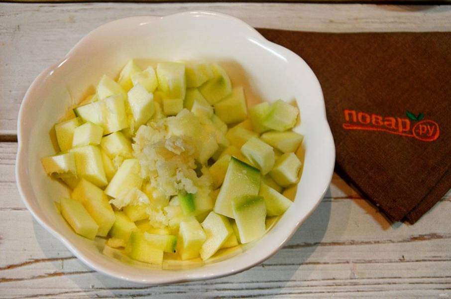 1. Кабачки почистите, удалите семечки и нарежьте кубиками.