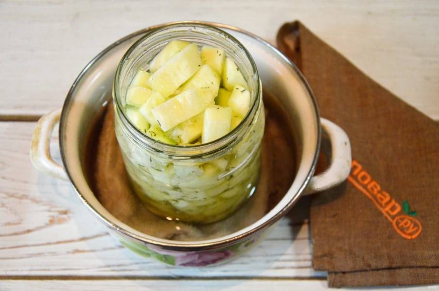 4. Выложите кабачки в банку, залейте горячим маринадом. В кастрюлю на дно положите полотенце, на него поставьте банку, долейте воды до половины банки, доведите до кипения. Стерилизуйте около 15 минут.