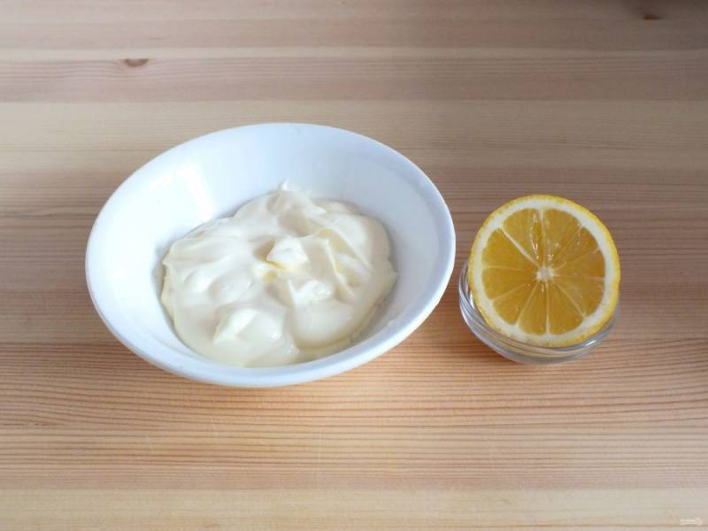 3 ст.л. майонеза выложите в миску, добавьте лимонный сок. Перемешайте. Заправка получится жидкой.