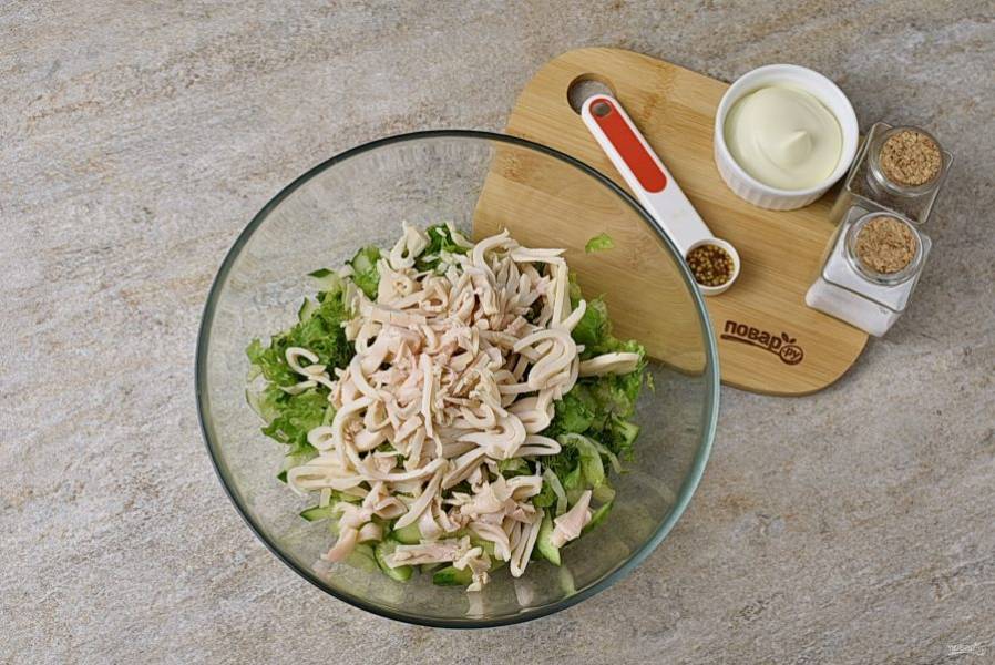 Слейте заливку из кальмара и нарежьте его толстой соломкой. Добавьте в салат.