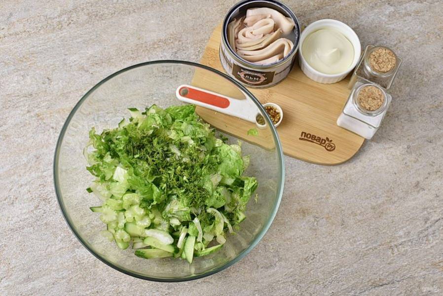 Добавьте рубленый укроп и порванный небольшими кусочками салат. Зелень должна быть не только вымыта, но и очень хорошо просушена. Оставьте пару листьев салата для украшения блюда.