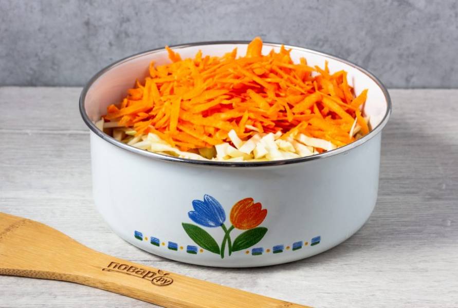 Капусту нашинкуйте не очень крупно, если она не молодая - помните руками с щепоткой соли. Добавьте натертую на крупной терке морковь.