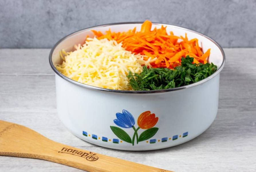 Затем добавьте натертый на мелкой терке сыр и рубленную зелень.