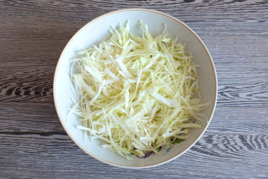 Капусту нарежьте тонкой соломкой. Добавьте щепотку соли и слегка пожмите её.