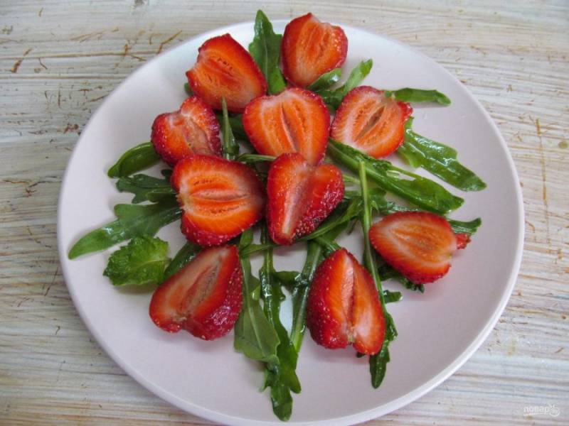 Разложить зелень на тарелку и разрезать клубнику, выложить на тарелку.