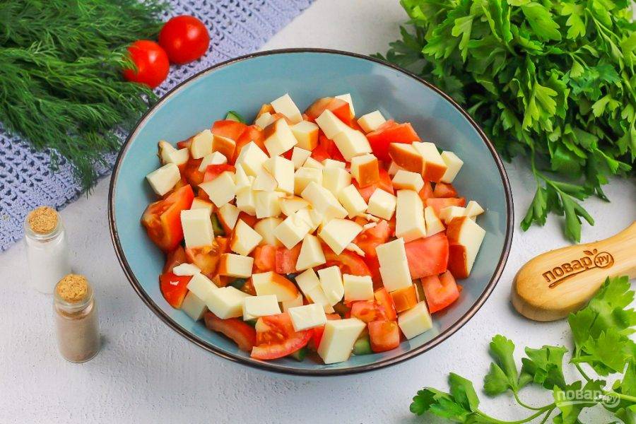 Колбасный сыр нарежьте пластинами или кружочками, а их — небольшими кубиками. Высыпьте сырную нарезку в емкость к остальным ингредиентам.