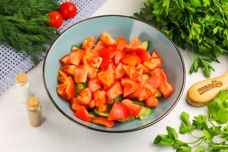 Вырежьте из помидоров зеленые сердцевинки и нарежьте их небольшими кубиками или ломтиками. Добавьте к огуречной нарезке.
