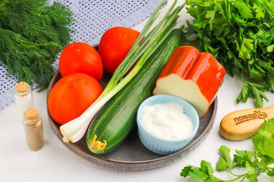 Подготовьте указанные продукты. Промойте огурец, помидоры и зеленый лук в воде, стряхните лишнюю влагу и промокните их бумажным полотенцем.