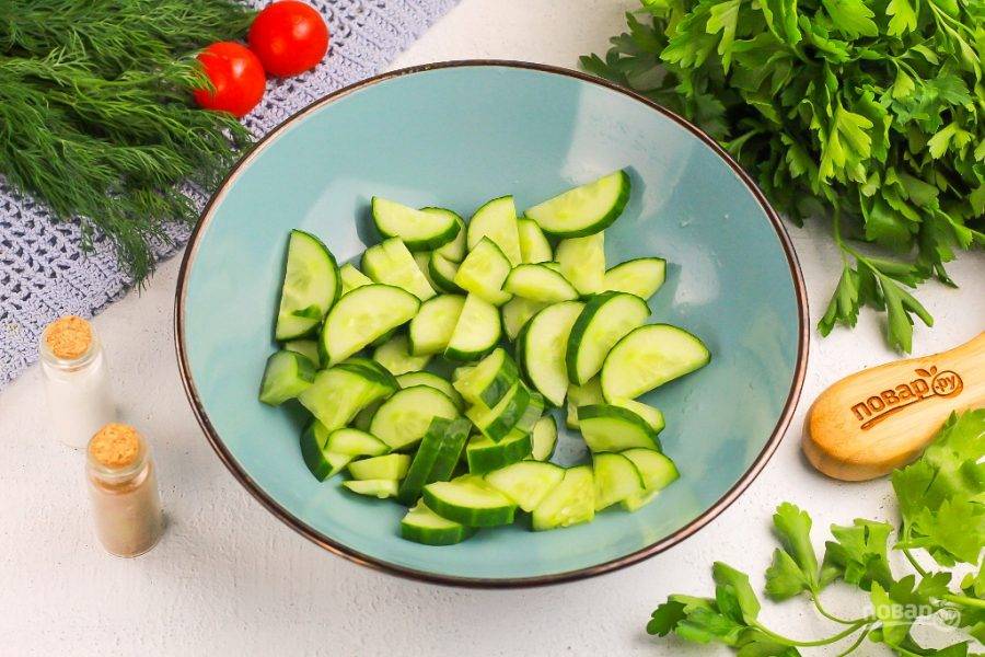 Срежьте хвостики с огурца и разрежьте его вертикально пополам. Нарежьте полукольцами, выкладывая в миску или салатник.