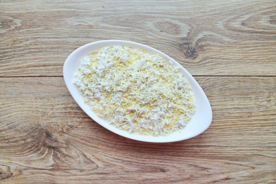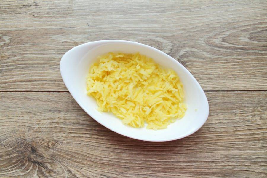 Картофель очистите от кожуры и натрите на крупной терке. Выложите картофель ровным слоем на дно салатника и смажьте майонезом.