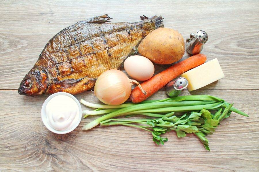 Подготовьте все необходимые ингредиенты для приготовления салата из копченого леща. Овощи отварите в мундире до готовности и остудите.