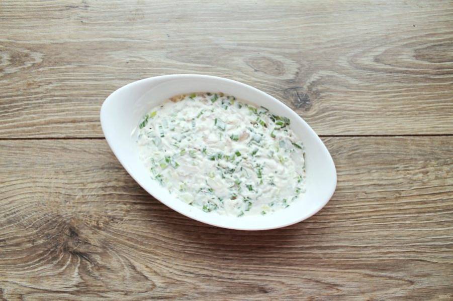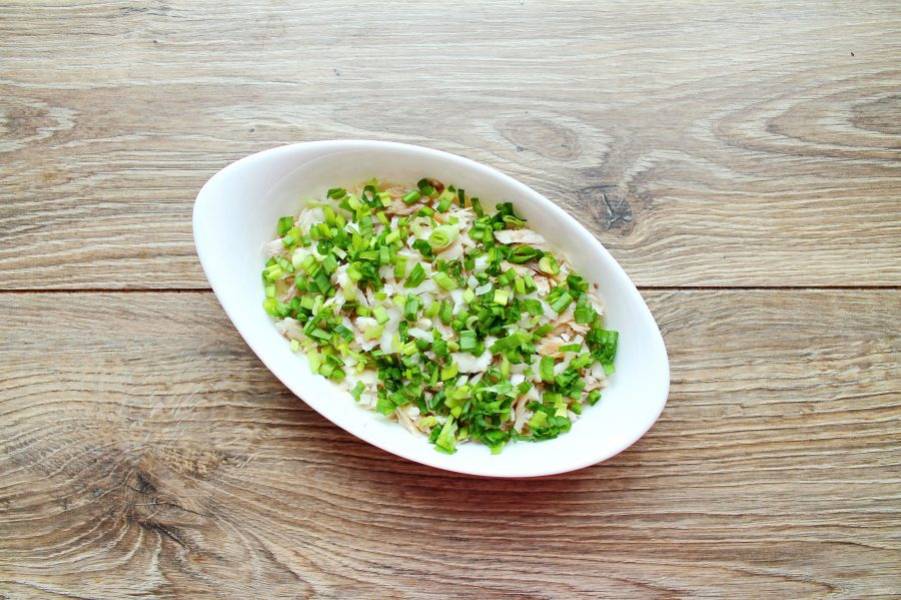 Мелко порежьте репчатый и зеленый лук, перемешайте. Разложите смесь лука поверх рыбного слоя.