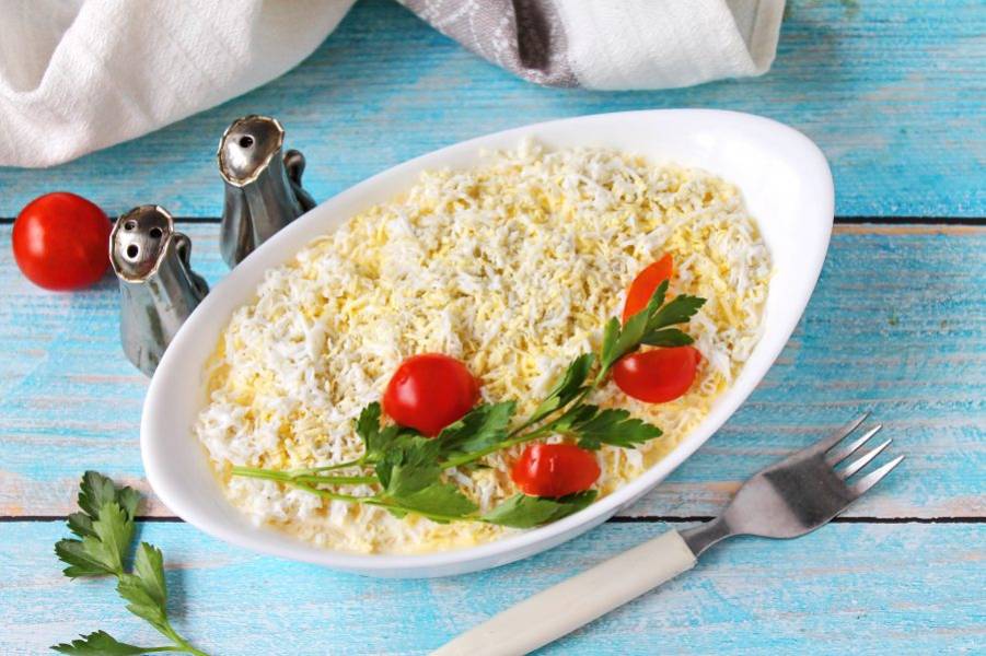 Поверх салата натрите яйца ровным слоем, украсьте и подавайте к столу.