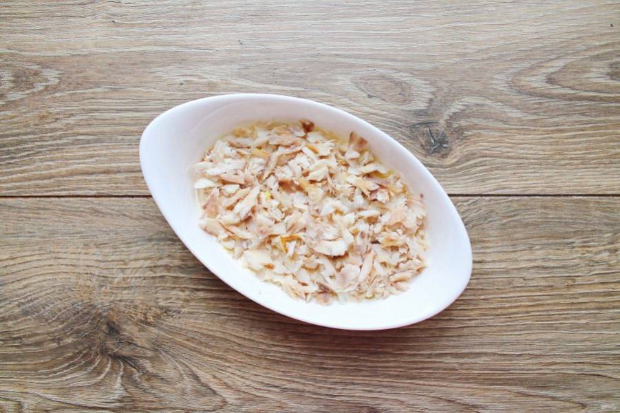 Копченый лещ очистите от верхнего слоя и очень тщательно переберите мясо рыбы от костей. Разложите рыбу поверх картофеля.