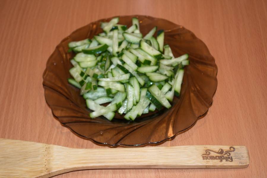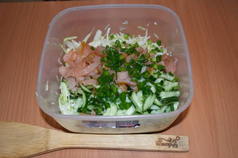 Соедините капусту, курицу, огурцы, добавьте измельченную зелень.