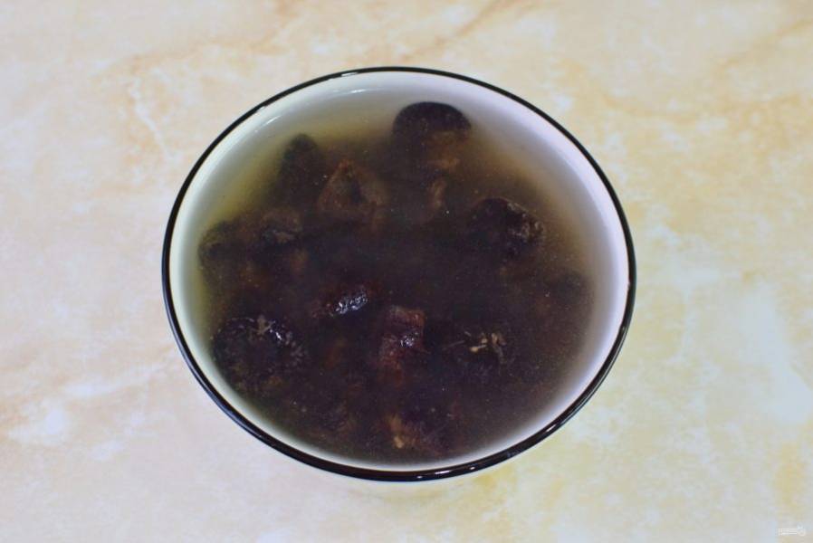 Чернослив залейте кипятком и оставьте на 10-15 минут, чтобы он стал мягче. Затем промойте его холодной водой и хорошо отожмите.