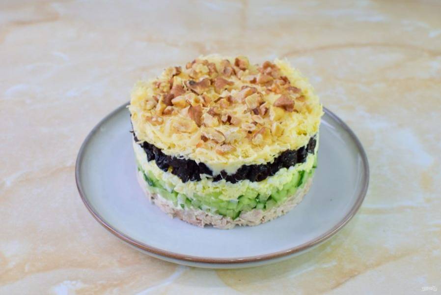 Верх салата посыпьте грецкими орехами. Дайте салату немного пропитаться и подавайте к столу.