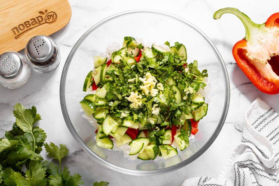Крупно порубите кинзу. Чеснок пропустите через пресс.