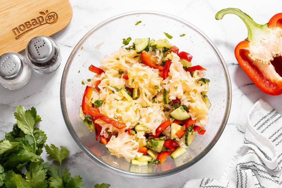 Все перемешайте. Подавать салат можно сразу, но вкуснее в начале оставить его на 1 час промариноваться и лишь затем подавать.