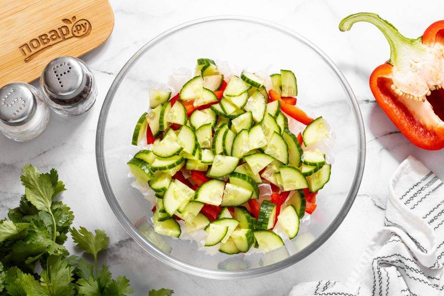 Болгарский перец нарежьте соломкой, добавьте в миску.