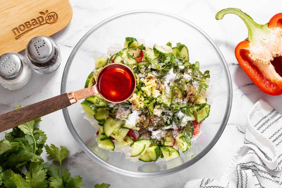 Влейте уксус, растительное и перцовое масло.