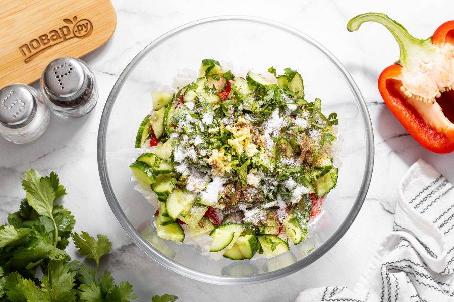 Добавьте соль, сахар, черный молотый перец и кориандр.